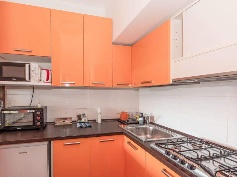 "Norby", appartement 2-kamers 50 m2, op de begane grond. Doelmatig ingericht: woon-/eetkamer, op 2 verdiepingen met panoramavenster met 1 divanbed (140 cm), open haard (alleen decoratie), Sat-TV en ventilator. Uitgang naar het terras. 1 2-pers. kamer. Kookhoek (4-pits kookplaat, waterkoker, magnetron, elektrische koffiemachine). Terras 20 m2. Terrasmeubelen, ligstoelen (2). Mooi uitzicht op het meer en de bergen. Ter beschikking: wasmachine, haardroger. Internet (WiFi, gratis). Parkeerplaats nr. A-305 (overdekt). Koelkast zonder vriesvak. Maximaal 1 huisdier/hond toegestaan. Rookmelders, brandblusser. IT103033C2IZP4E4KX