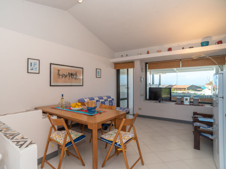 Huis in een rij 3-kamers 90 m2. Eenvoudig en doelmatig ingericht: woon-/eetkamer met 1 2-pers divanbed, Sat-TV en stereo-installatie. Uitgang naar het terras. Kookhoek (4-pits kookplaat, oven, diepvriezer) met eettafel. Souterrain: 1 2-pers. kamer. 1 kamer met 2 bedden. Uitgang naar de tuin. Douche/bidet/WC. Air-conditioning (extra). Terras 15 m2 gedeeltelijk overdekt. Mooi uitzicht op zee. Ter beschikking: wasmachine. Parkeerplaats. Maximaal 1 huisdier/hond toegestaan. IT090089C2000S9357