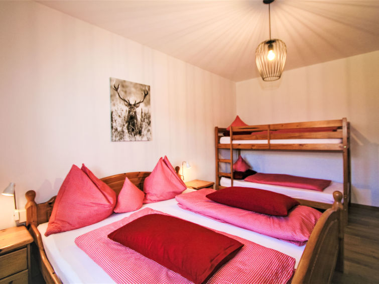 "Christine", appartement 3-kamers 78 m2 op de 1e verdieping. Het objekt is geschikt voor 6 volwassenen. Ruim en licht: hal. 1 2-pers. kamer. Uitgang naar het balkon. 1 kamer met 1 x 2 stapelbedden (90 cm, lengte 200 cm), 1 2-pers bed. Woon-/eetkamer met eettafel en Sat-TV (Flatscreen TV). Open keuken (oven, afwasmachine, 4 keramische glas kookplaten, magnetron). Douche/WC. Groot balkon 7 m2, op het westen gelegen, zithoek in de tuin. Barbecue. Zeer mooi panoramazicht op de bergen en het landschap. Ter beschikking: kinderstoel, kinderbed tot 2 jaar. Internet (WiFi, gratis). Parkeerplaats (3 Auto's). Geschikt voor families. Niet rokers woning. Geen lift.