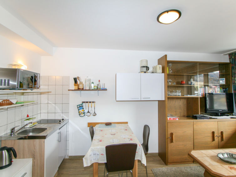 Appartement 2-kamers 27 m2 op de 1e verdieping. Doelmatig en gezellig ingericht: woon-/slaapkamer met 1 divanbed, eettafel en Sat-TV. 1 2-pers. kamer met douche/WC. Kookhoek (2-pits kookplaat, oven, broodrooster, waterkoker, grill, elektrische koffiemachine, combimagnetron). Terras. Terrasmeubelen. Mooi uitzicht op de bergen en de plaats. Ter beschikking: haardroger. Internet (WiFi, gratis). Maximaal 1 huisdier/hond toegestaan. Rookmelders.