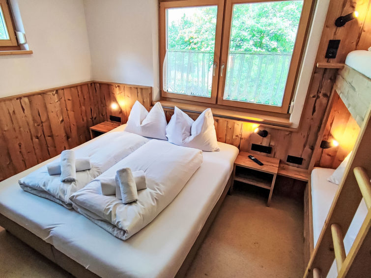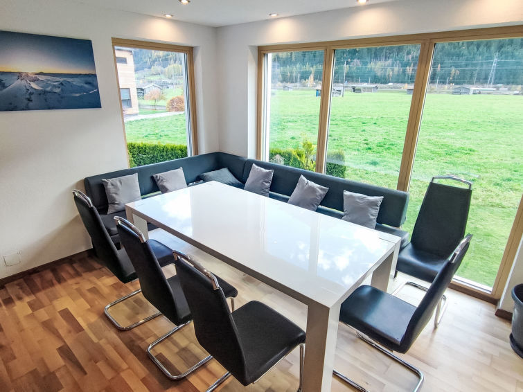 "Malfon", appartement 5-kamers 122 m2, op verhoogde begane grond. Ruim en licht, comfortabel en gezellig ingericht: hal. 1 2-pers. kamer met Sat-TV (Flatscreen TV). 2 kamers, elke kamer heeft 1 x 2 stapelbedden, 1 2-pers bed en Sat-TV (Flatscreen TV). Woon-/eetkamer met open haard (alleen decoratie), eethoek en Sat-TV (Flatscreen TV). Uitgang naar het terras. Keuken (oven, afwasmachine, 4 keramische glas kookplaten, broodrooster, waterkoker, magnetron, elektrische koffiemachine). Douche, douche/WC, aparte WC. Verwarming. Parketvloeren. Groot terras 11 m2, op het zuiden gelegen. Terrasmeubelen. Mooi uitzicht op de bergen. Ter beschikking: Internet (Internet (WiFi), gratis). Parkeerplaats (3 Auto's). Geschikt voor families. Koelkast zonder vriesvak, niet rokers woning.