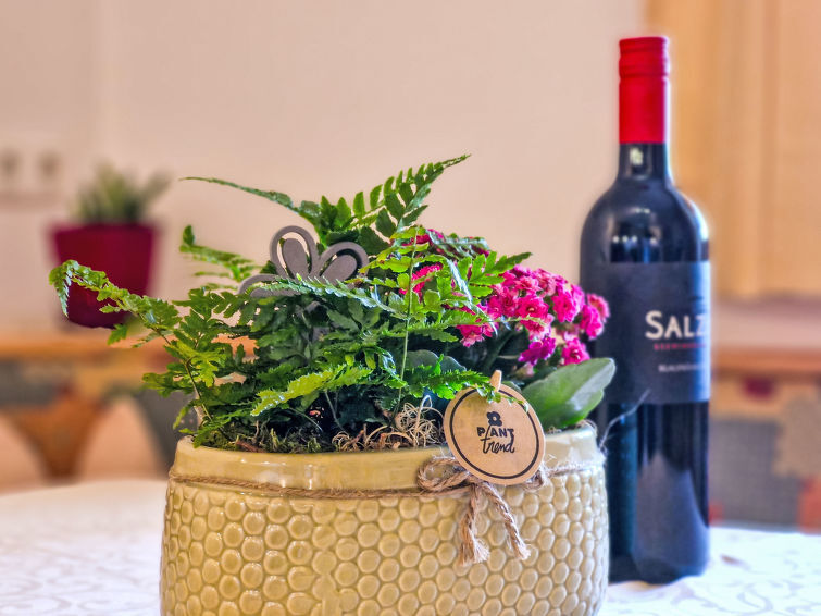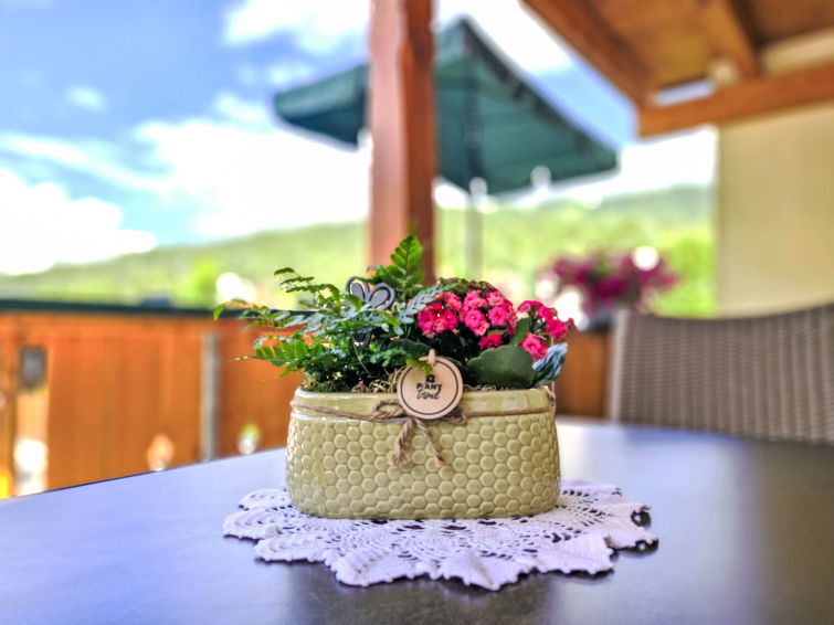 Appartement 3-kamers 60 m2, op verhoogde begane grond. Het objekt is geschikt voor 2 volwassenen + 2 kinderen. Comfortabel en smaakvol ingericht: hal. Woon-/slaapkamer met 1 2-pers divanbed (150 cm, lengte 220 cm), Sat-TV (Flatscreen TV), stereo-installatie. 1 2-pers. kamer. Woonkeuken (oven, afwasmachine, 4 keramische glas kookplaten, waterkoker, magnetron, elektrische koffiemachine) met eethoek. Douche/WC. Groot terras 15 m2, op het zuiden gelegen. Terrasmeubelen. Zeer mooi uitzicht op het landschap. Ter beschikking: haardroger. Internet (WiFi, gratis). Niet rokers woning. Privé ingang.