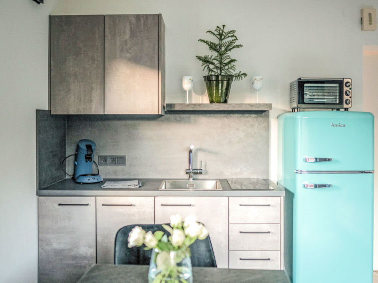 "Anny 1", appartement 2-kamers 40 m2 op de 1e verdieping. Comfortabel en modern ingericht: woon-/slaapkamer met 1 divanbed, eettafel en Sat-TV (Flatscreen TV). 1 2-pers. kamer. Open keuken (2 keramische glas kookplaten, waterkoker, elektrische koffiemachine). Douche/WC. Elektrische verwarming. Balkon terras. Terrasmeubelen. Zijdelings uitzicht op het meer. Ter beschikking: Internet (WiFi, gratis). 1 huisdier/hond toegestaan. Rookmelders. 50628-001695-2025