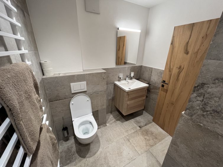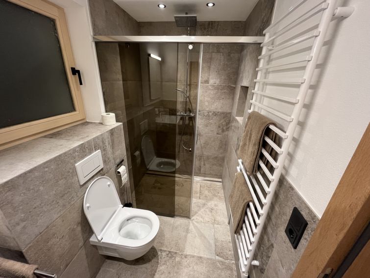 "Martina", appartement 3-kamers 65 m2, op de begane grond. Zeer modern ingericht: hal. 2 2-pers. kamers, elke kamer heeft douche/WC en TV (Flatscreen TV). Open keuken (oven, afwasmachine, 4 inductiekookplaten, broodrooster, waterkoker, elektrische koffiemachine) met 1 divanbed, eethoek en Sat-TV (Flatscreen TV). Groot terras. Terrasmeubelen, barbecue. Mooi panoramazicht op de bergen en het landschap. Ter beschikking: wasmachine. Internet (Internet (WiFi)). Niet rokers woning.
